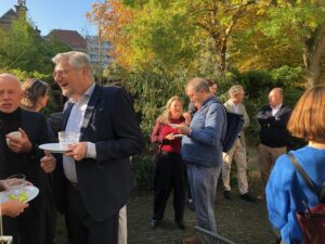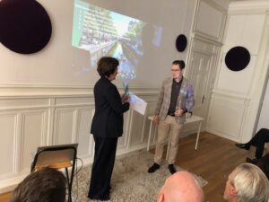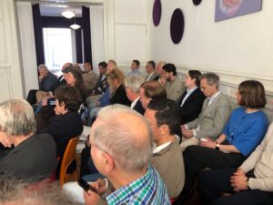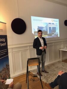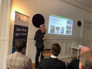 Na deze zeer informatieve presentatie volgde de presentatie Thuis in de binnenstad van Den Haag van Richard Koek, Expert stedenbouw Gemeente Den Haag. Als het ware ‘thuis in een groene metropool aan zee’. Hij lichtte de omgevingsvisie Den Haag 2050 toe, wat Den Haag typisch haags maakt en dat de omgevingsvisie voortbouwt op de typisch Haagse kenmerken. De binnenstad moet richting 2050 een ‘huiskamer’ voor iedereen zijn, waar wordt gestudeerd, gewoond, gewinkeld, gewerkt en gerecreëerd. Het is een gebied waar mensen met verschillende achtergronden elkaar ontmoeten en waar iedereen kan genieten van de vele bezienswaardigheden, winkels, horecagelegenheden en culturele voorzieningen, zoals musea en historische gebouwen. Helaas is er een achterblijvende ontwikkeling van het aantal banen in de Haagse regio. Het aantal inwoners blijft groeien. De verwachting is dat tot 2040 de Haagse regio zal groeien met 5000 inwoners per jaar. Richard constateerde dat de overeenkomsten van punten die in het binnenstadsplan 2033 beschreven zijn ongeveer overeen met het manifest van de Eigenarenvereniging Binnenstad Den Haag. Er zal constant gewerkt moeten blijven worden aan de binnenstad van Den Haag om een levendige, groene en verbonden binnenstad te ontwikkelen en te behouden. Deze presentatie eindigde met het toekomstbeeld van de Haagse binnenstad in 2033 waarin o.a. de voetganger centraal staat, de stevige vergroening van pleinen en grachten is gebeurd en dat de stad een sterk Haags karakter heeft maar toch met een brede mix aan culturen.
